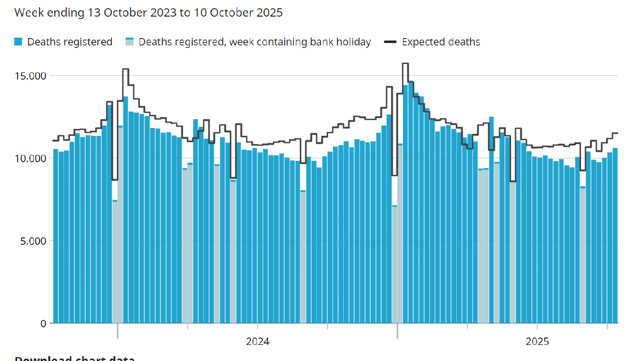 weekly ONS graphs of Total Deaths from April 2020 until Tuesday 24th November 2021.