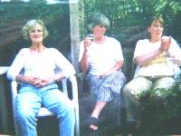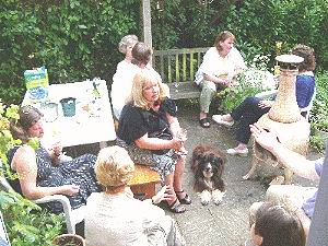 but some were not too bad. e.g. this one of Lara, the border collie doggy, who came with Richard and Sue from Newbury, and this one of June, Angela, and Isobel. My two pictures (better versions can be emailed) show some of you indoors and outdoors. Below you can see Chris, Richard and Bert discussing "geocaching nitty gritty" while others outside drink and natter :-)