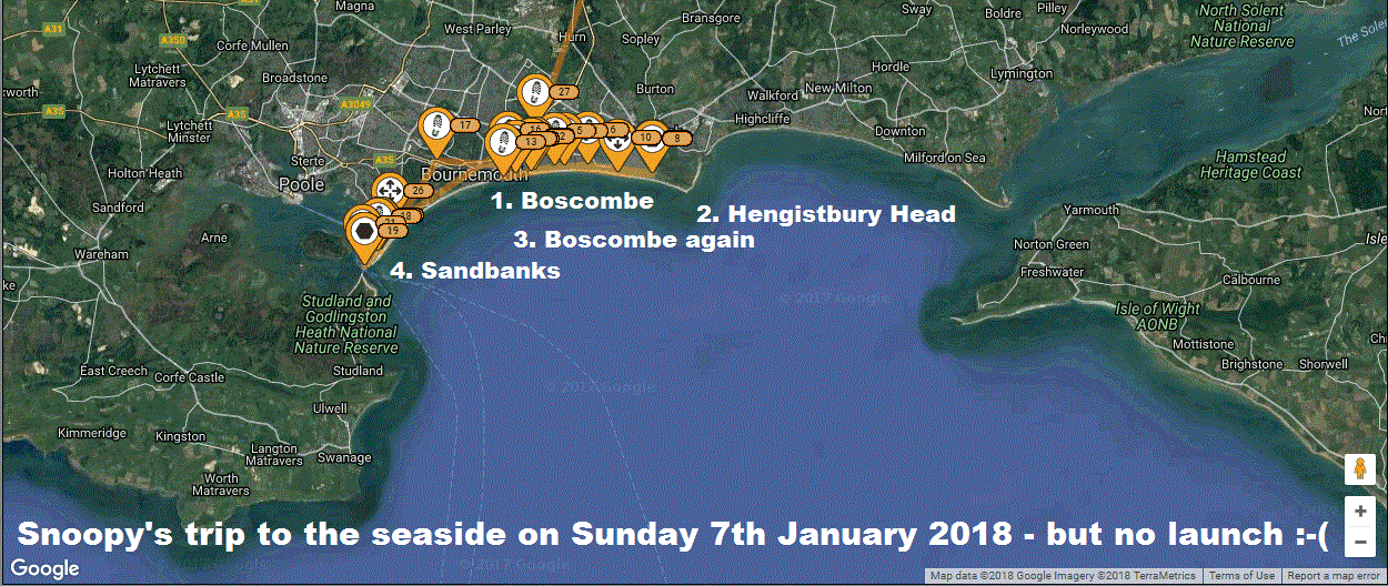 Snoopy was to be launched from near Boscombe, on the south coast of England, at about midday, on Sunday 7th January 2018. Conditions such as tide, surf, and wind, can be seen on MagicSeaweed - pity it was not an accurate forecast !