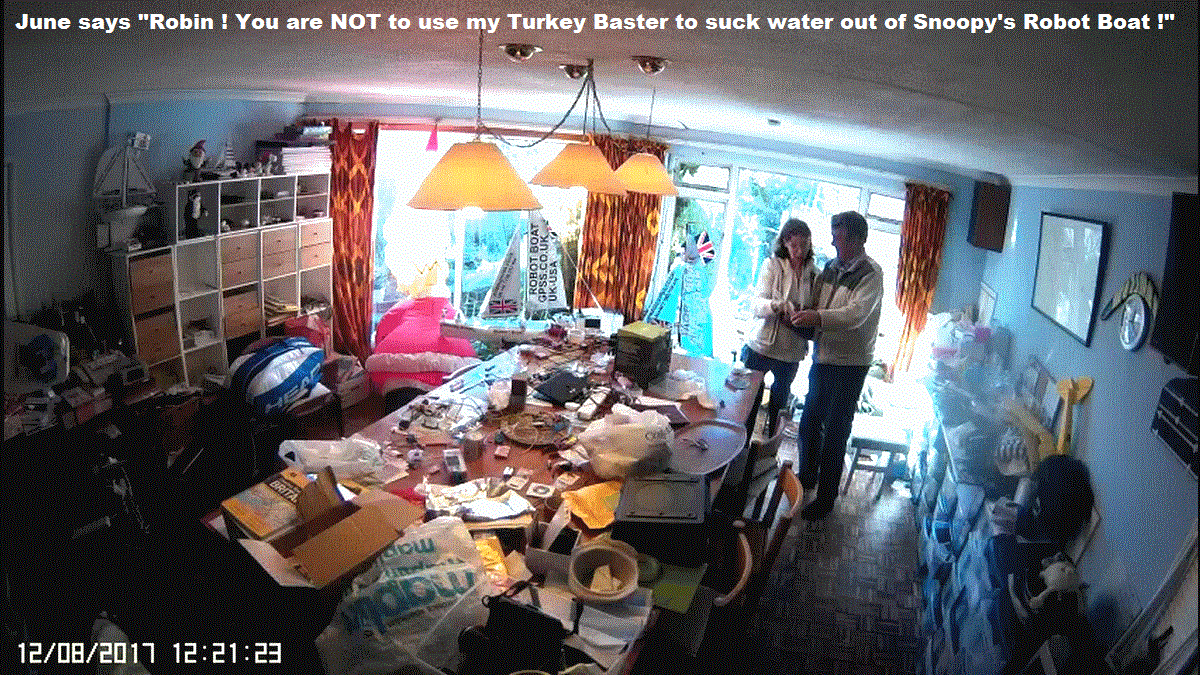 Our Games Room needs a tidy up before Christmas Lunch here with the family. Women can be so unreasonable. For those using a google-translate flag, the caption reads .... June says "Robin ! You are NOT to use my Turkey Baster to suck water out of Snoopy's Robot Boat !".