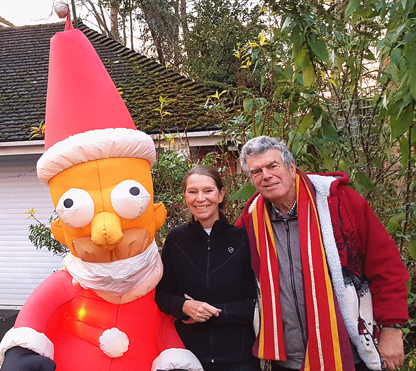 Here, on the right, is a recent picture of Homer, June, and myself, after June put up the Christmas lights.